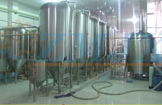 啤酒發(fā)酵系統(tǒng)有發(fā)酵罐、清酒罐、暫存罐組成;發(fā)酵是啤酒生產(chǎn)中極其重要的工藝過程。是一個(gè)有酵母參與的復(fù)雜的生化反應(yīng)過程,發(fā)酵罐為錐底圓柱形,罐體具備自身冷卻裝置,可很容易地控制發(fā)酵溫度;罐底為錐形,回收酵母及清洗都很方便;罐體具有CIP清洗系統(tǒng),保證了生產(chǎn)中的衛(wèi)生安全。具備了先進(jìn)的國(guó)際發(fā)酵工程技術(shù),可采用PLC自動(dòng)控溫技術(shù)。全過程控制啤酒發(fā)酵。